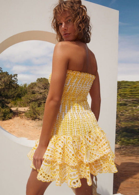 Zaria Strapless Ruffle Mini Dress Smocked Yellow Eyelet