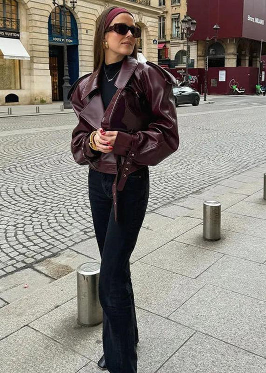 Valencia Jacket �Cropped Faux Leather Belted Moto in Wine Red