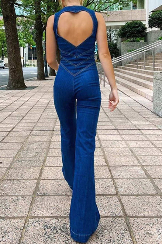 V Neck Zipper Cutout Sleeveless Denim Jumpsuits