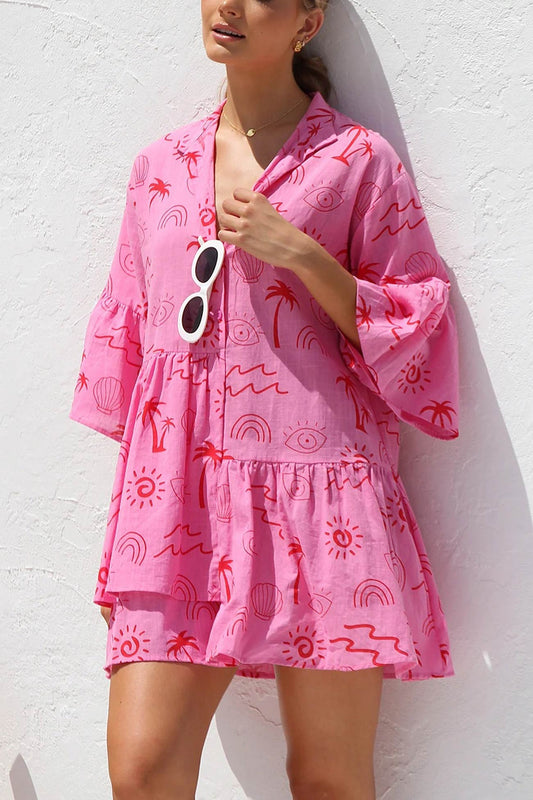 Printed Flares Sleeve Ruched Mini Dress