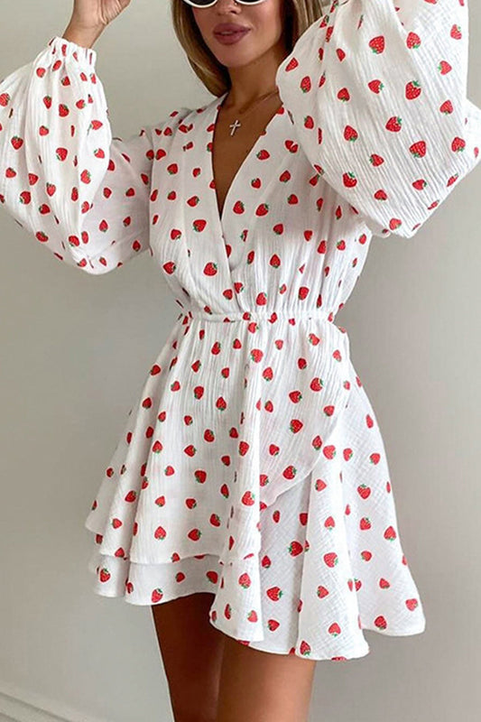 V Neck Pleated Trumpet Sleeve Ruffle Dress