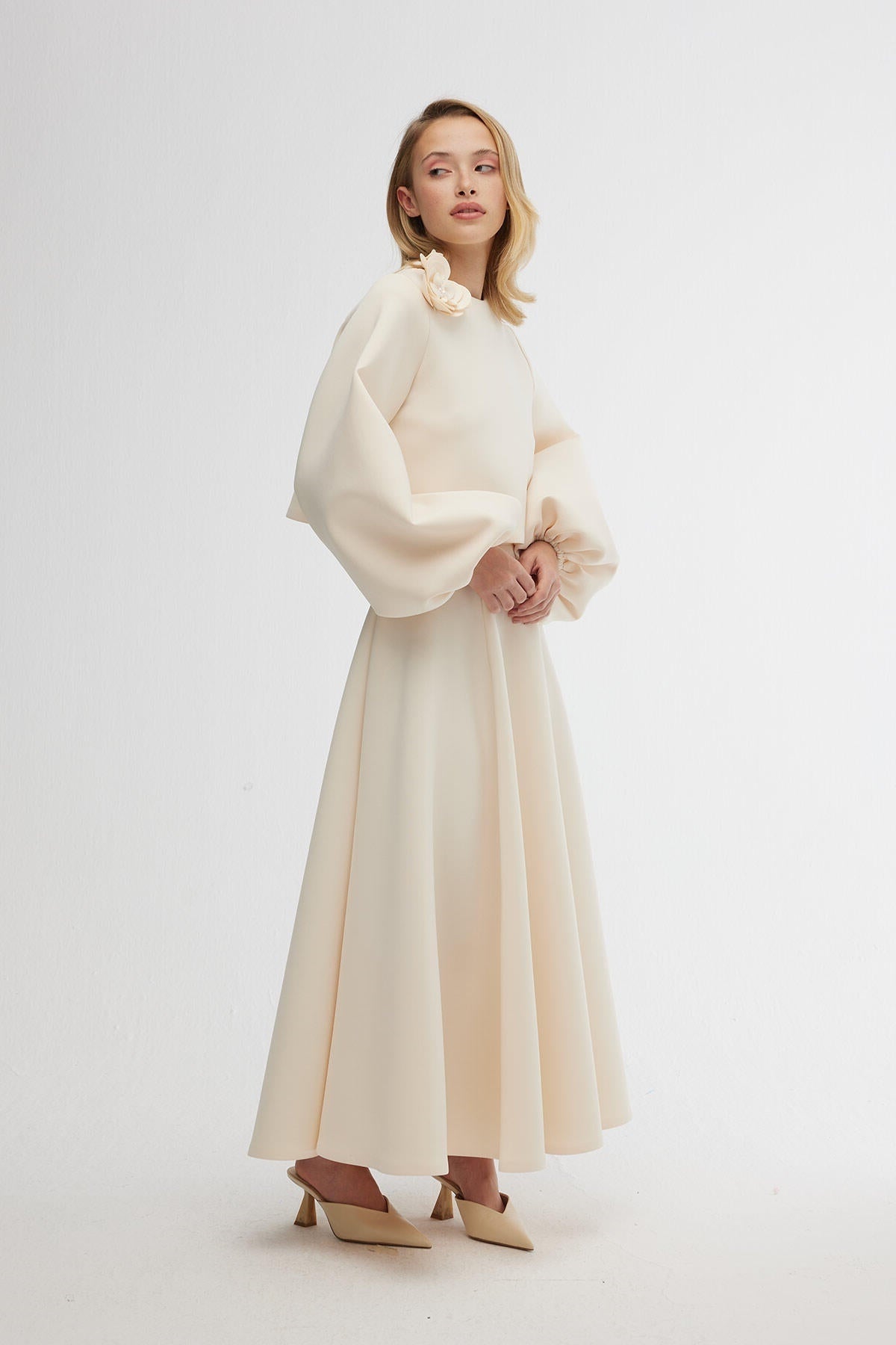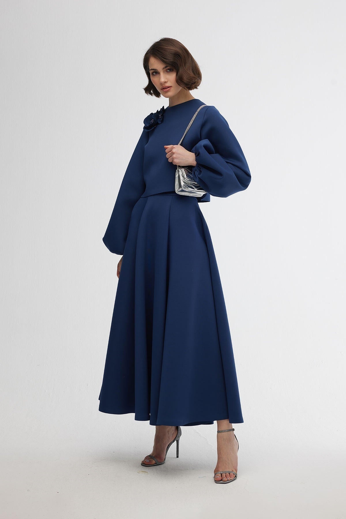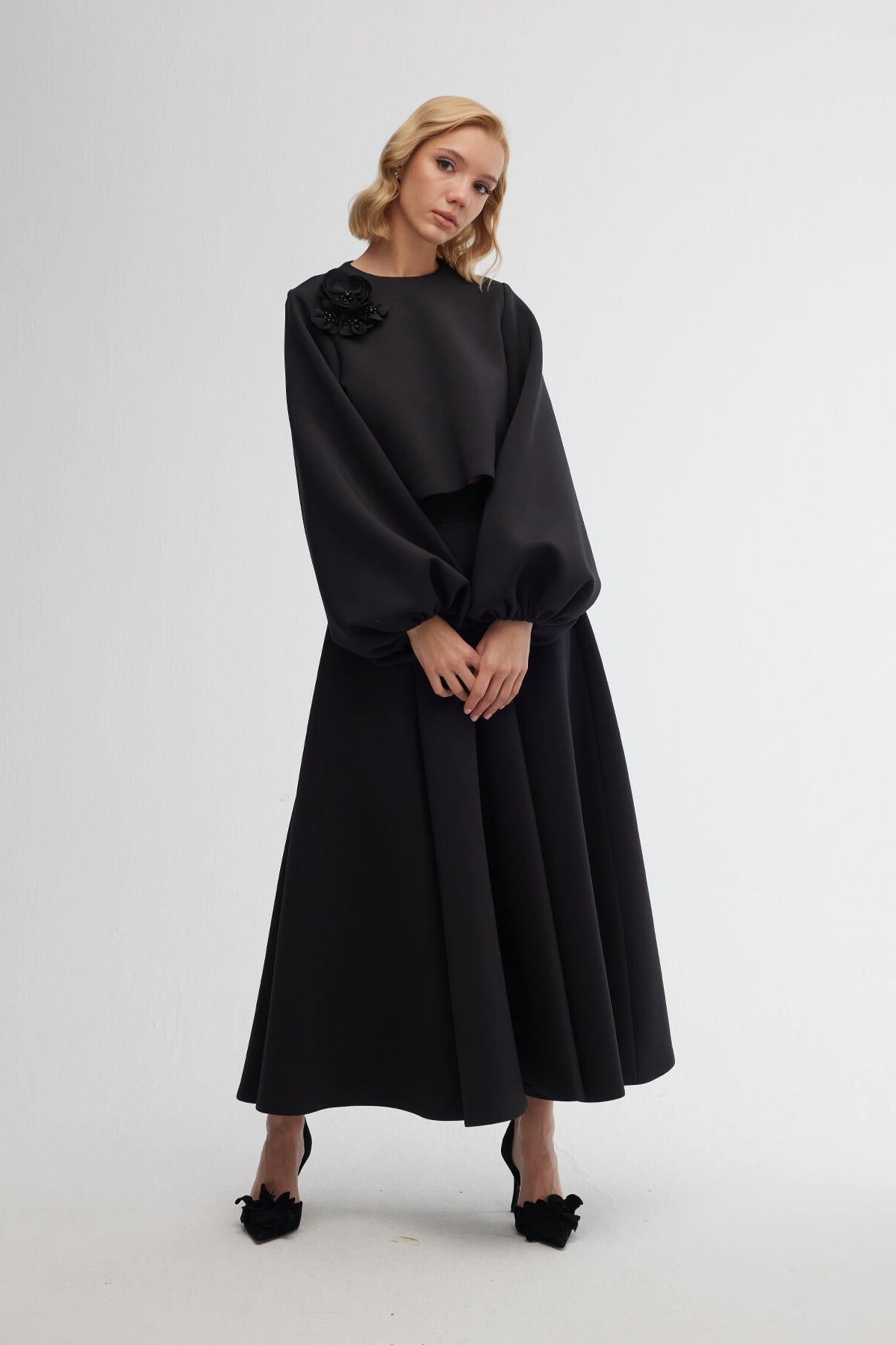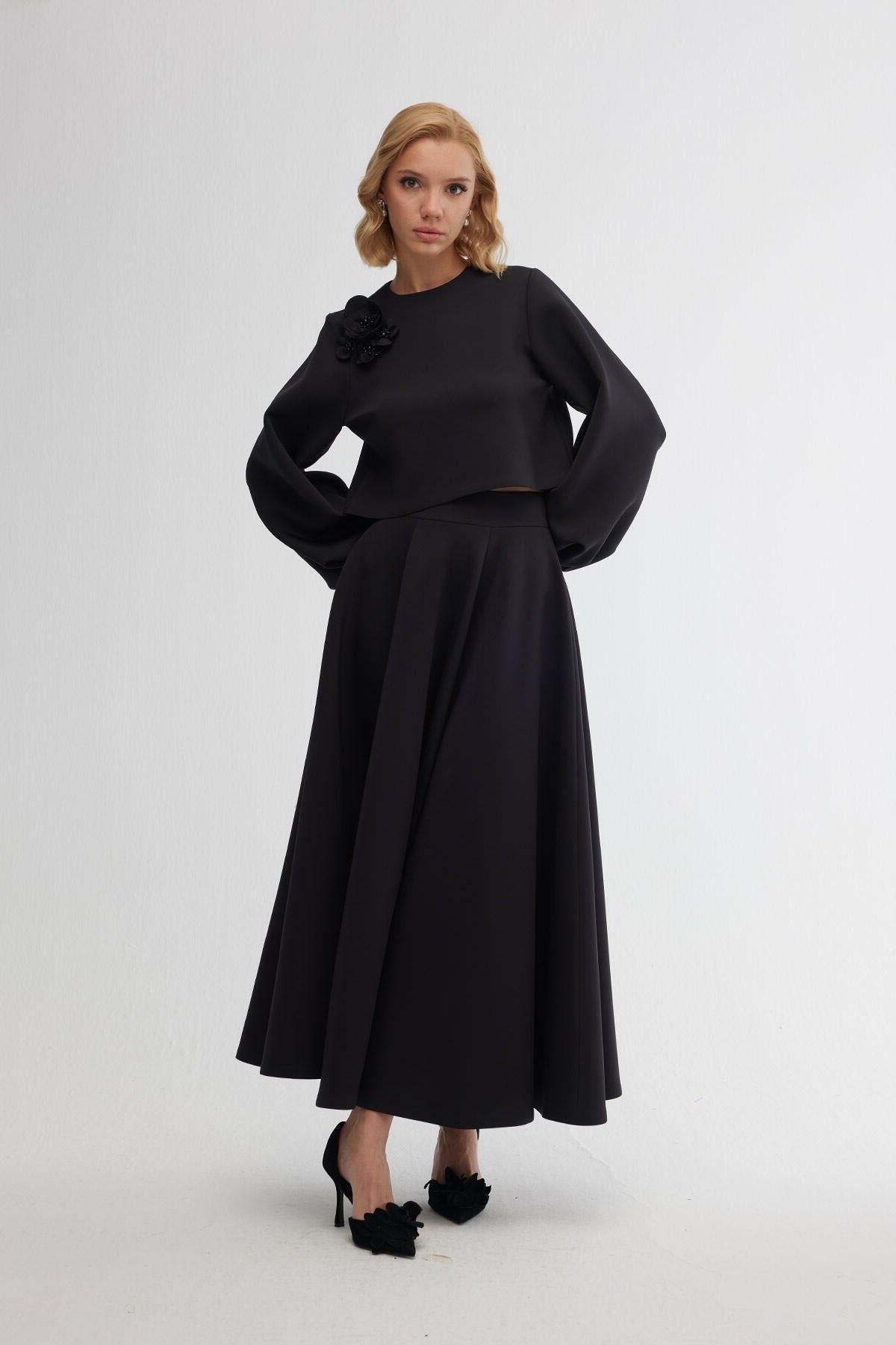 Crew Neck, Puff Sleeve Top, 3D Flower, Maxi Skirt.