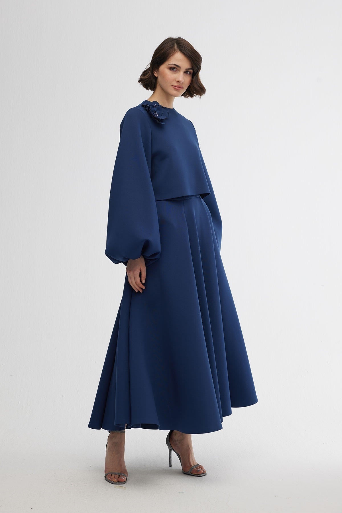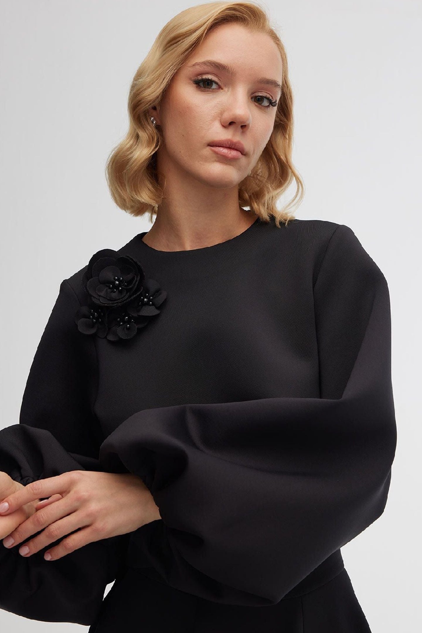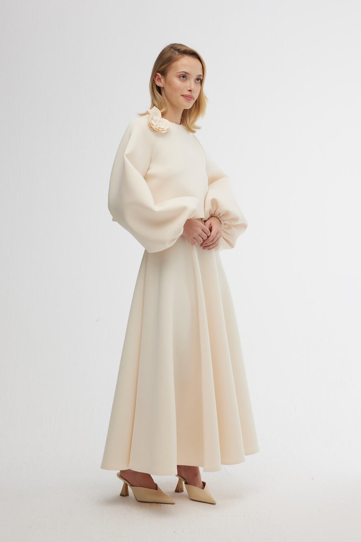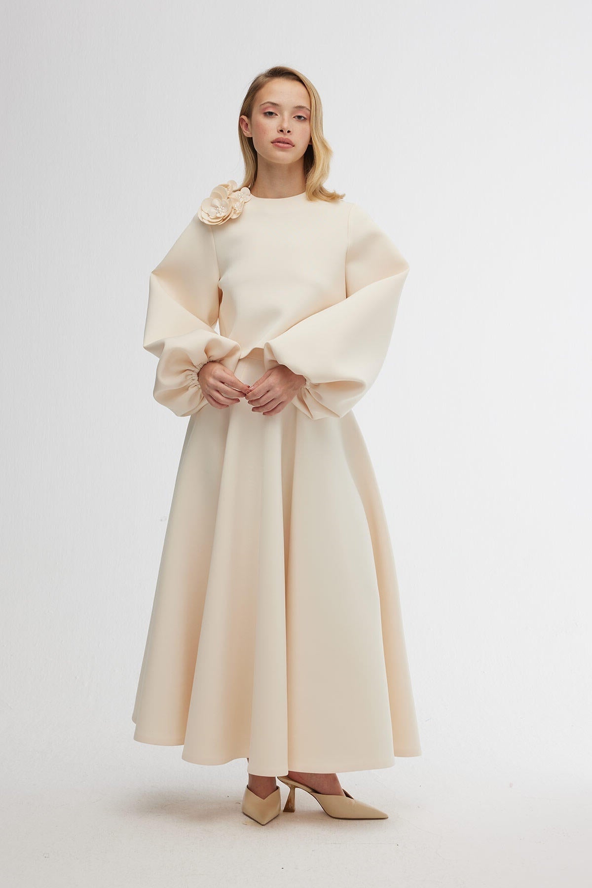 Crew Neck, Puff Sleeve Top, 3D Flower, Maxi Skirt.