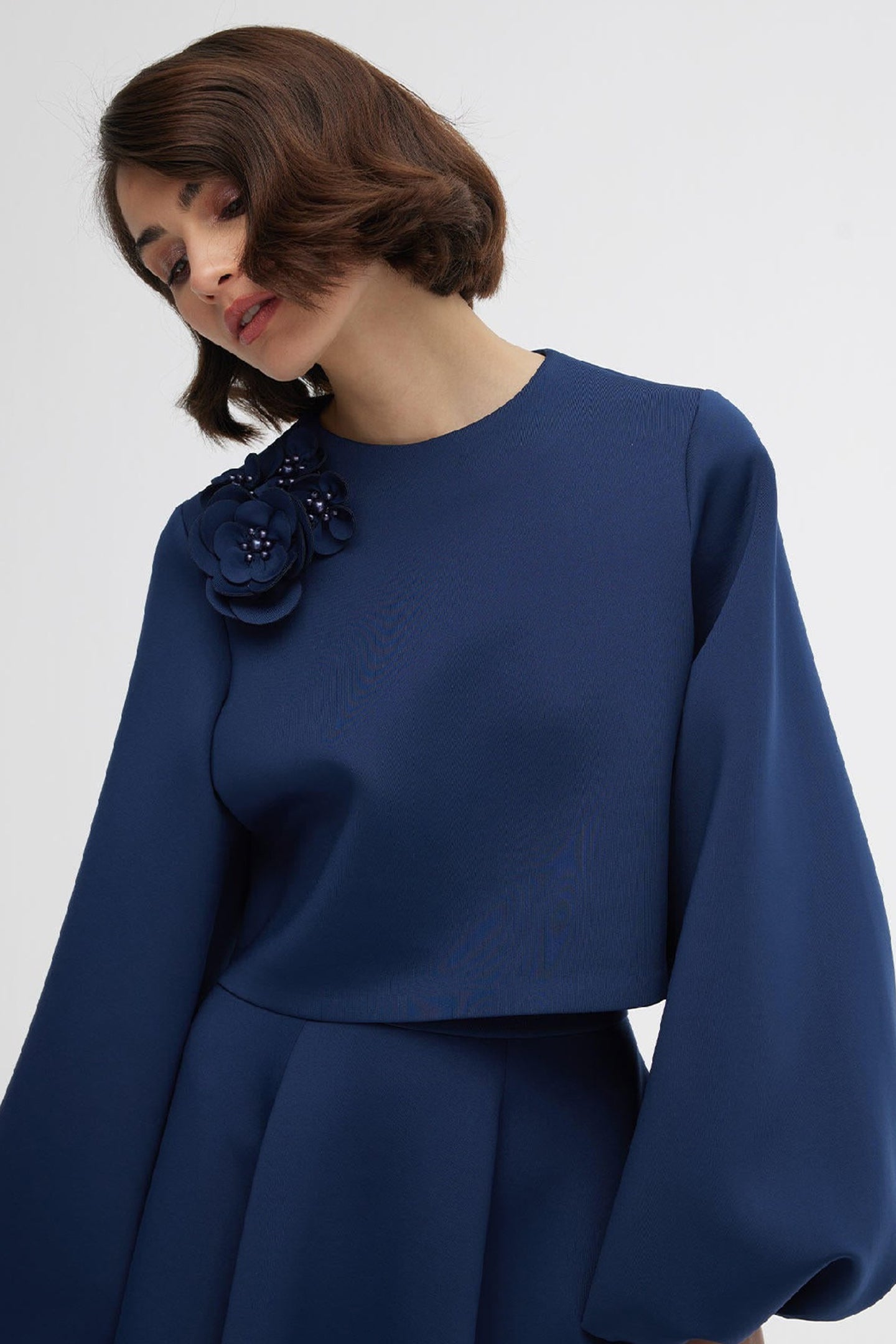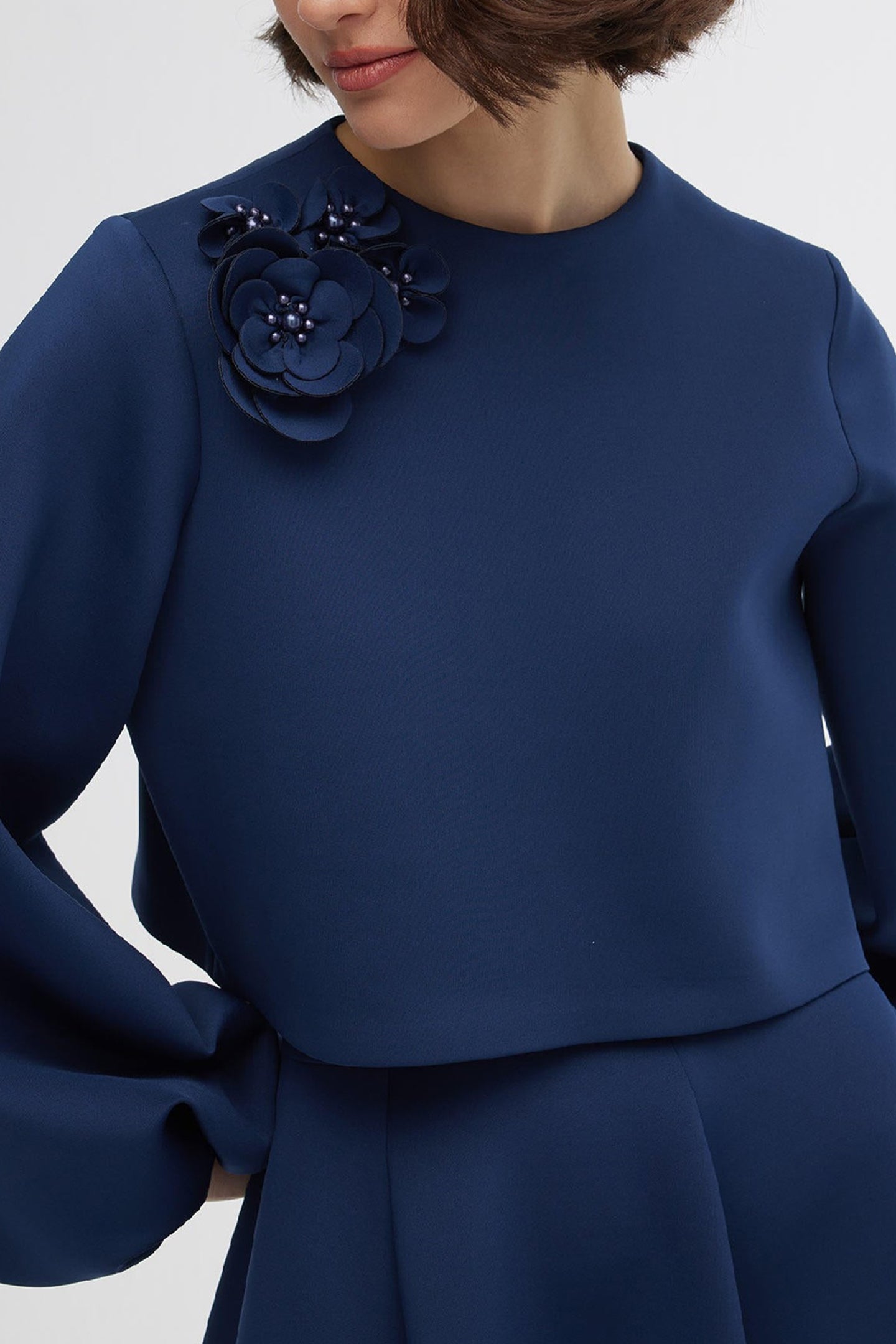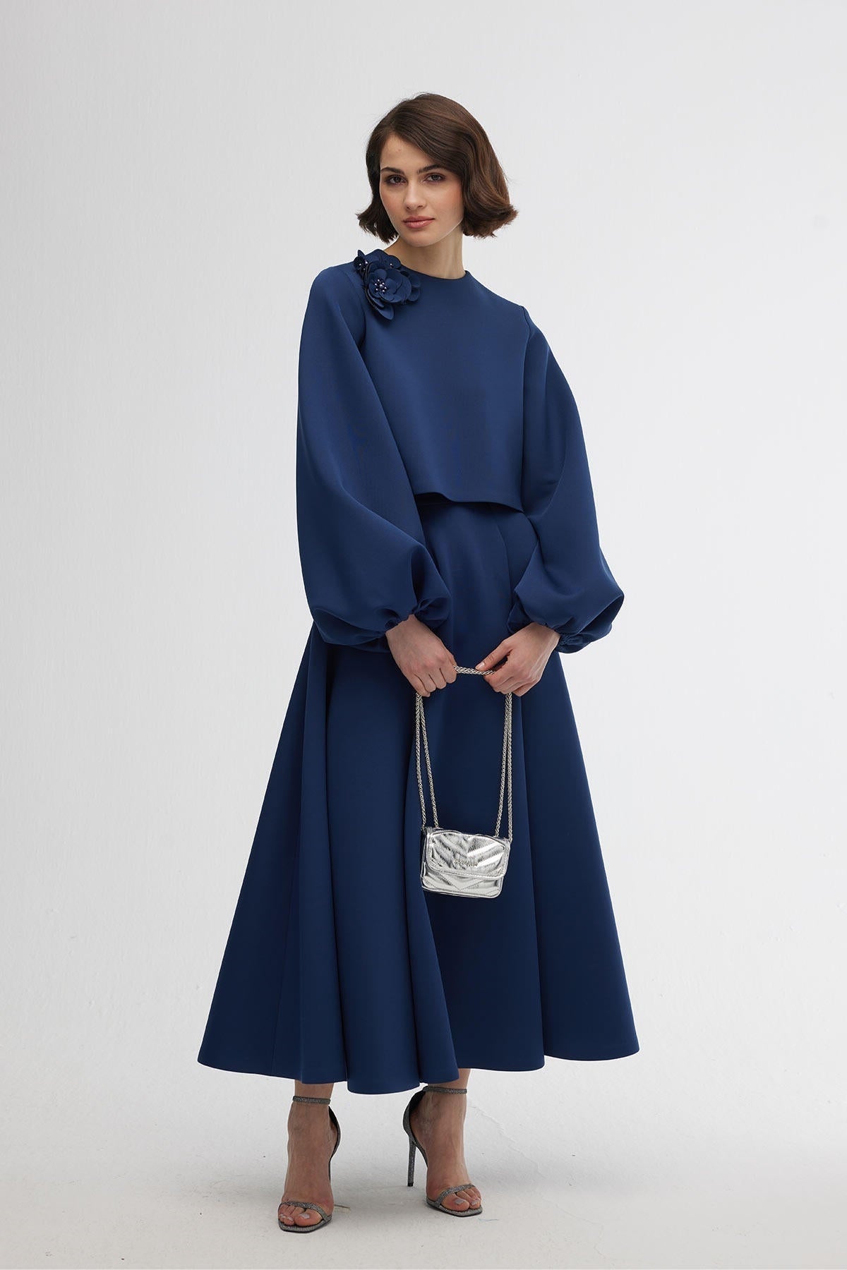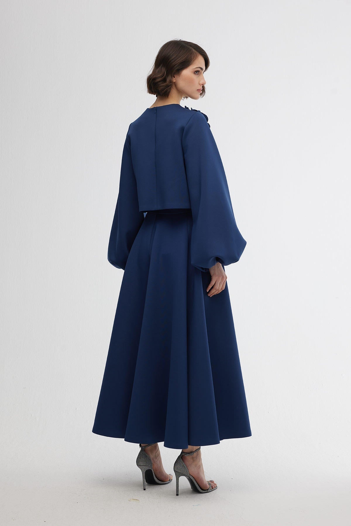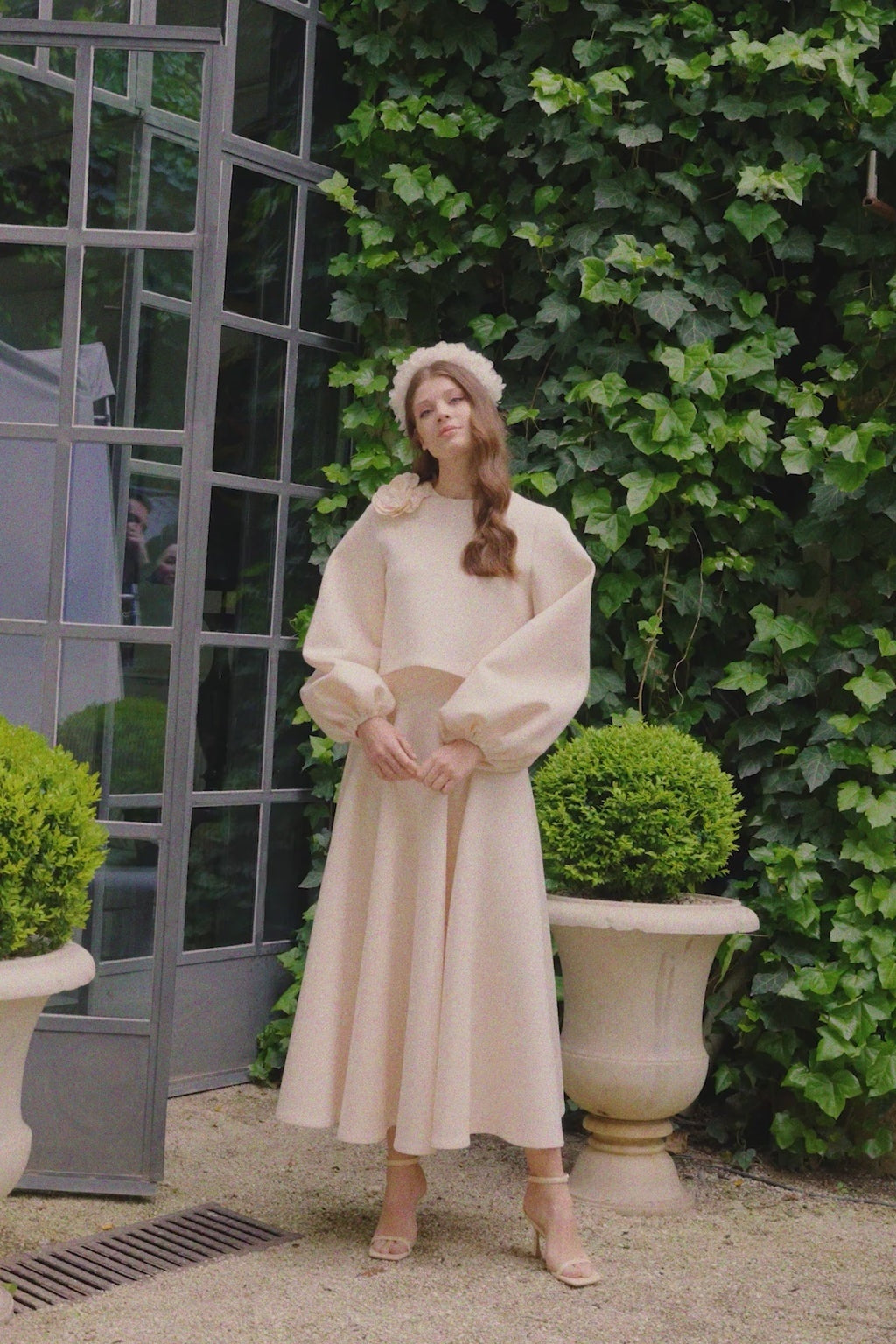 Crew Neck, Puff Sleeve Top, 3D Flower, Maxi Skirt.