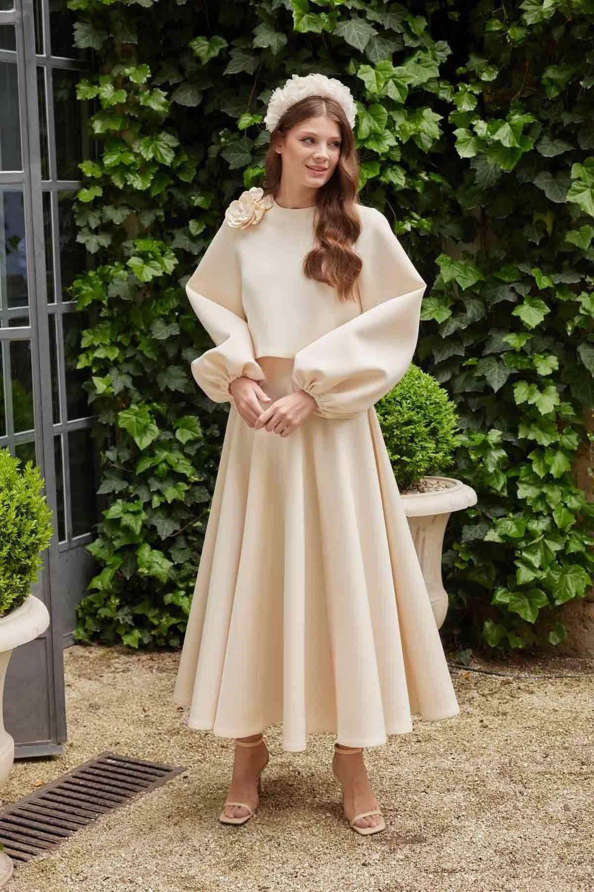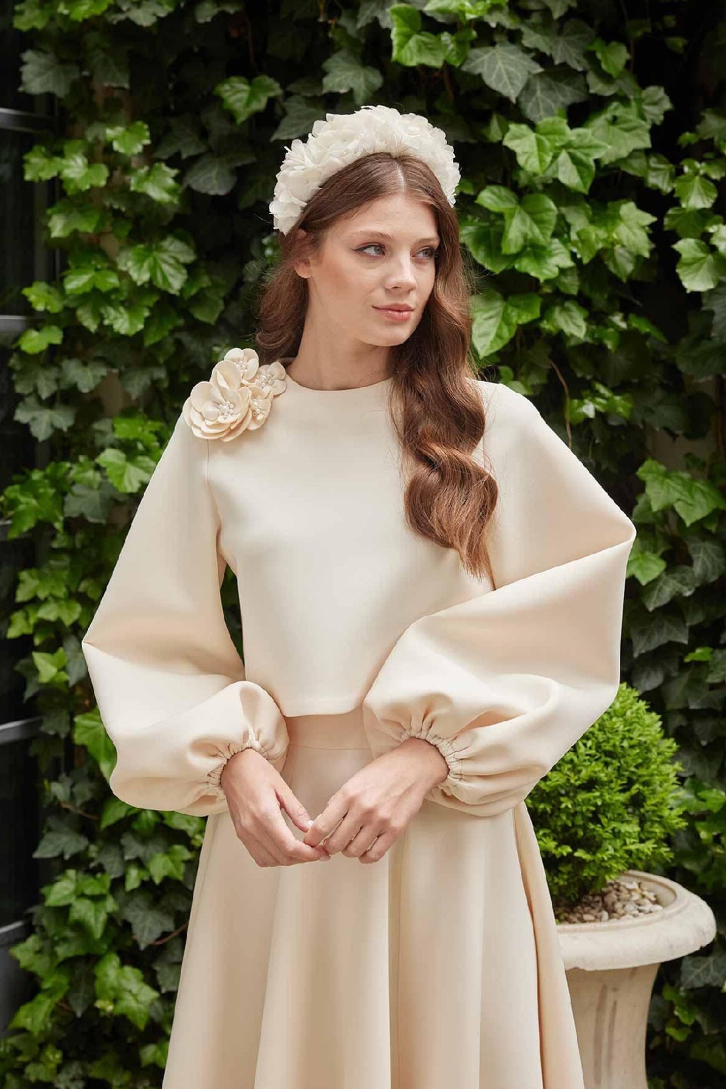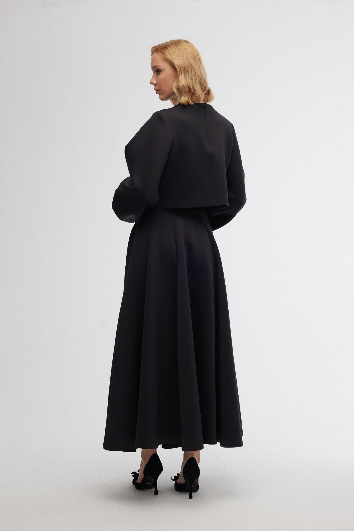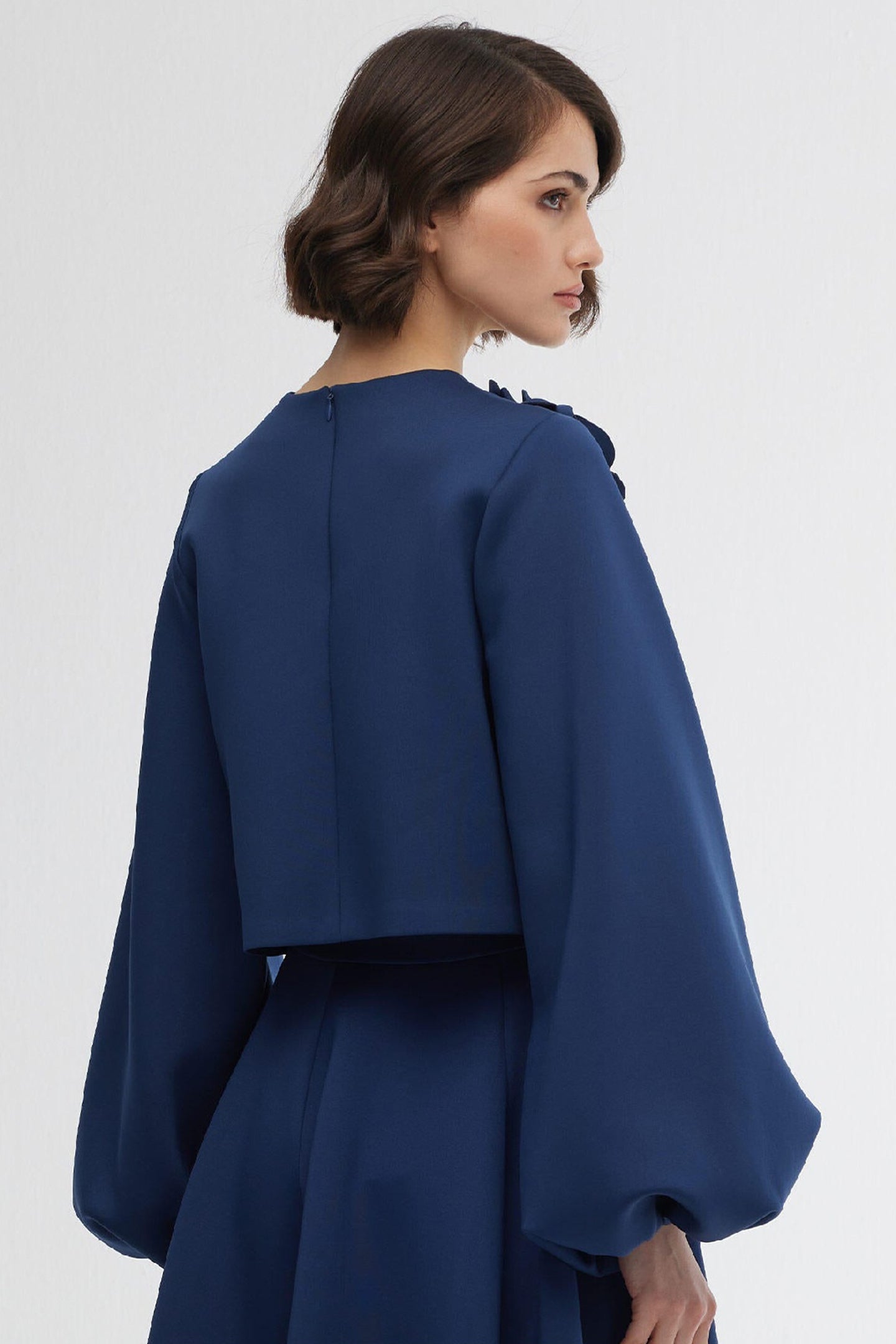 Crew Neck, Puff Sleeve Top, 3D Flower, Maxi Skirt.
