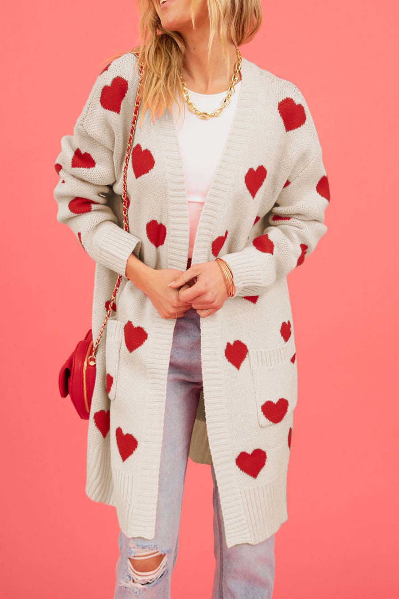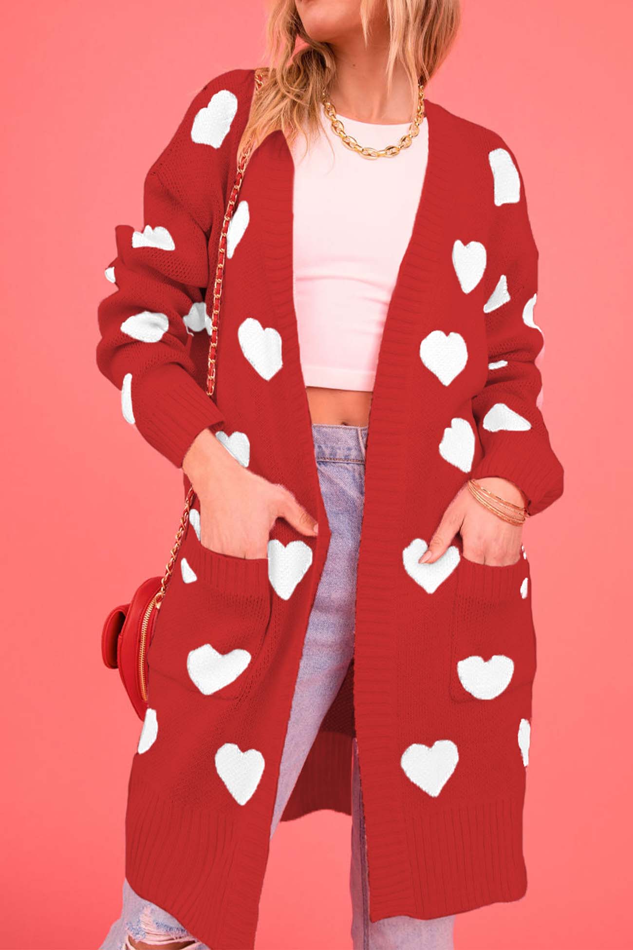 Heart Open Front Pocket Long Cardigan